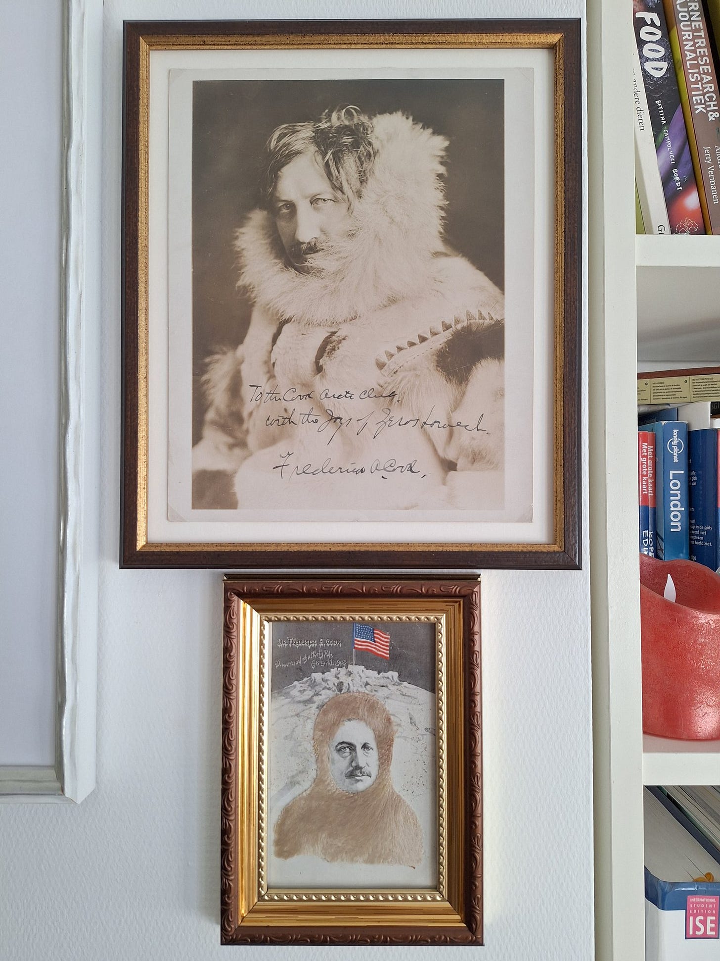 [A signed photo of Frederick Cook circa 1910 and a 1909 postcard of Frederick Cook, on the wall of my living room.]